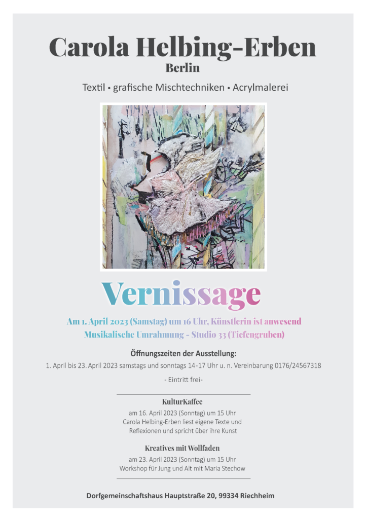 Am 1.4.2023 findet um 16 Uhr die Vernissage in Anwesenheit der Künstlerin und mit musikalischer Umrahmung von Studio 33 im Dorfgemeinschaftshaus Riechheim statt.